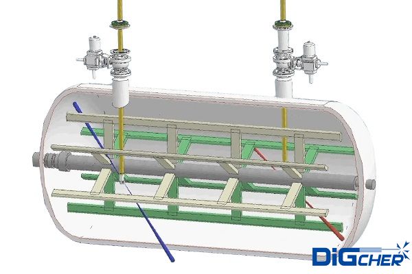德高潔PVDF臥式反應(yīng)釜自動(dòng)化清洗系統(tǒng),根據(jù)PVDF生產(chǎn)過程中,二氟乙烯(VDF)單體在臥式反應(yīng)釜聚合反應(yīng)的工作特點(diǎn),結(jié)合臥式反應(yīng)釜自身結(jié)構(gòu),設(shè)計(jì)研發(fā)的一套專用于臥式反應(yīng)釜清洗的裝置。由高壓水清洗裝置搭載自動(dòng)化清洗系統(tǒng)方式,實(shí)現(xiàn)操作簡單,自動(dòng)化程度高,安全環(huán)保、節(jié)約時(shí)間,代替人工作業(yè)?梢苿(dòng)式設(shè)備,體積小,靈活性強(qiáng),多點(diǎn)定位機(jī)構(gòu)深度清洗,高壓水射流技術(shù),三維旋轉(zhuǎn)噴頭與伸縮桿的復(fù)合運(yùn)動(dòng),可以對反應(yīng)釜內(nèi)攪拌軸背面、底部、上封頭等位置的清洗,在不對反應(yīng)釜造成物理損傷的情況下,實(shí)現(xiàn)360°無死角清洗。解決現(xiàn)有清洗方法中存在的自動(dòng)化程度低、耗時(shí)費(fèi)力、容易造成人身傷害等問題。